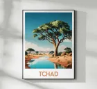 Poster di viaggio raffigurante il Ciad, con i suoi paesaggi aridi, gli iconici alberi di acacia e un'oasi di pace sotto un cielo blu brillante. Ideale per una decorazione murale autentica e selvaggia.