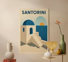 Questo poster vintage di Santorini illustra il fascino unico dell'isola greca con le sue case bianche, la cupola blu e le bouganville in fiore sul bordo del Mar Egeo. Un poster mediterraneo luminoso che invita al viaggio e al relax.
