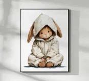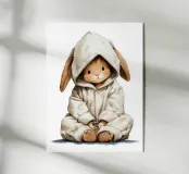 Questo affascinante poster per la cameretta di un bambino presenta un adorabile coniglietto vestito con un pigiama con cappuccio, seduto con uno sguardo tenero e commovente. Realizzata in un delicato stile acquerello, questa illustrazione conferisce morbidezza e comfort a qualsiasi decorazione murale. Ideale per la cameretta di un bambino o di una bambina, crea un'atmosfera calda e avvolgente. Perfetto anche come regalo per il bambino, questo poster farà la gioia di grandi e piccini.
