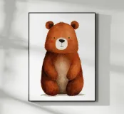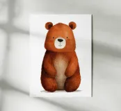 Affascinante illustrazione ad acquerello di un tenero orso bruno, seduto con calma e sguardo gentile. Una decorazione da parete ideale per la cameretta di un bambino o di un neonato, che porta calore e tenerezza.