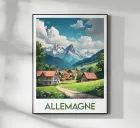 Illustrated poster of a traditional German village nestling in the Alps, surrounded by snow-capped mountains, deep forests and flowery meadows. A perfect wall decoration for a peaceful, natural atmosphere.
