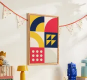 Un dinamico poster astratto costruito su un sistema modulare a griglia, che mostra un'audace interazione di forme geometriche e forti colori di ispirazione primaria: blu marino intenso, giallo brillante e rosso vibrante. La composizione presenta quadranti con grandi semicerchi, un quadrato centrale con un nitido motivo triangolare giallo e un blocco rosso con una griglia di nove cerchi chiari. Questo disegno cattura perfettamente lo spirito dell'estetica Bauhaus e Mid-Century Modern grazie alla sua enfasi sulla struttura, sulla funzionalità e sulle forme semplificate. Questo download digitale ad alta risoluzione (7000x5000 pixel, 300 dpi) fornisce una
