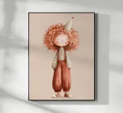 Questo allegro poster per la cameretta di un bambino presenta un adorabile clown dai capelli rossi e ricci, che indossa pantaloni con bretelle e un cappello da festa a righe. Realizzata in un delicato stile acquerello, questa illustrazione aggiunge un tocco di estrosità e divertimento a qualsiasi decorazione murale. Ideale per la cameretta di un bambino o di una bambina, stimola l'immaginazione e crea un'atmosfera giocosa e colorata. Un poster originale perfetto per un mondo divertente e poetico.