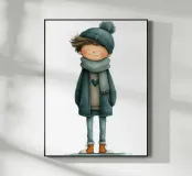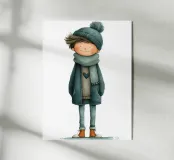Questo poster morbido e caldo per la cameretta di un bambino presenta un ragazzino vestito con un cappello a pompon, una grande sciarpa e un cappotto, tutti nei toni del blu-verde. Il suo tenero sorriso e lo stile acquerellato aggiungono un'atmosfera rilassante e invernale alla decorazione murale. Perfetta per la cameretta di un bambino o di una bambina, questa illustrazione poetica aggiunge un tocco di morbidezza, modernità e comfort. È ideale anche come regalo per il bambino.