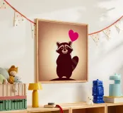 Un affascinante procione tiene in mano un vivace palloncino a forma di cuore, che emana uno spirito giocoso in un design minimalista. Lo sfondo caldo esalta l'atmosfera stravagante della scena.