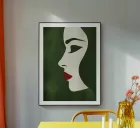 Minimalist illustration of an elegant female profile in white contrasting with a deep green background. The red lips and clean lines underline a sophisticated, timeless aesthetic. This modern composition captures grace and mystery, ideal for visual projects that focus on elegance and simplicity.