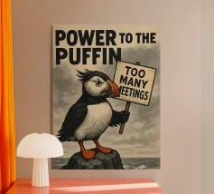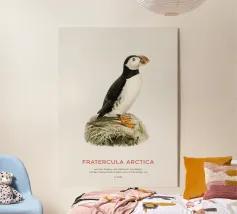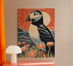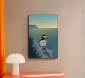 Un design di viaggio minimalista con un simpatico pulcinella di mare o puffin sul paesaggio costiero dell'Islanda.
