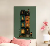 Un'affascinante illustrazione di un'alta casa di città divisa in calde tonalità autunnali, decorata con zucche su ogni balcone e finestre luminose. Una stravagante figura con testa di zucca e cappello a cilindro sta educatamente fuori, aggiungendo un tocco eccentrico a questa tranquilla scena di Halloween. Una stampa d'arte perfetta per portare la magia stagionale con un tocco raffinato.