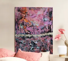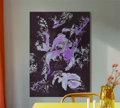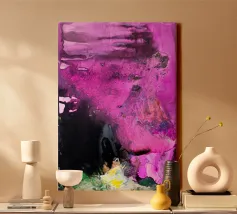 "Punk" è un'opera intensa e astratta che rappresenta una collisione esplosiva di colori e caos. La composizione è dominata da un'elettrizzante tonalità di fucsia e magenta, contrastata da un nero profondo e impenetrabile. La tecnica del flusso crea bolle effervescenti e bordi fluidi che trasmettono un'energia cruda e incontrollata. L'abbinamento aggressivo dei colori e la texture caotica riflettono l'estetica ribelle e il volume visivo del movimento punk. Alcune piccole macchie di giallo e verde nella parte inferiore spezzano la dominanza del colore principale.