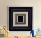 A geometric abstraction of nested squares blending deep indigo, earthy brown, and soft taupe. The alternating bands create a rhythmic progression inward, evoking balance, symmetry, and a subtle sense of depth. This piece merges modernist precision with a grounded, natural palette—ideal for contemporary interiors with a refined aesthetic.