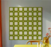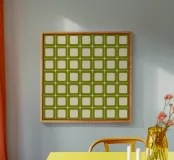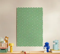 Questo disegno presenta quadrati verdi retrò con un'estetica di chiara ispirazione anni '60. Il suo fresco layout geometrico aggiunge un sottile tocco di colore, pur rimanendo pulito e moderno. Ideale per un arredamento eclettico e moderno.