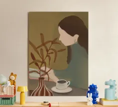 "Quiet Contemplation" è una raffigurazione serena e astratta di una donna profondamente pensierosa che culla una tazza in mano. I toni caldi e terrosi si fondono armoniosamente con i colori pastello, evocando un senso di calma e introspezione. Con pennellate minimaliste ma espressive, quest'opera d'arte cattura un momento di riflessione in un ambiente tranquillo e illuminato dal sole. La semplicità della composizione, arricchita da una sottile vegetazione sullo sfondo, aggiunge un tocco di tranquillità e consapevolezza, rendendola un pezzo perfetto per gli spazi che cercano un'atmosfera calma e contemplativa. Progettato da BALIKA HOMES.