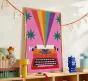 An illustration of a vintage typewriter with a vibrant rainbow flowing out of it. The piece is a powerful, joyful, and creative symbol of writing, imagination, and storytelling.