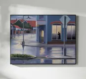 Viewed from a car, a lone figure is silhouetted in a doorway across a rain slicked street. The scene, with its wet reflections and moody lighting, evokes a sense of melancholy, mystery, and urban solitude.