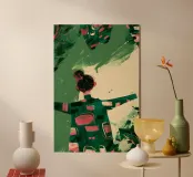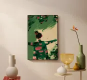 An expressive figurative composition capturing movement in its rawest form. Elongated proportions and outstretched arms create a dynamic silhouette, while bold, imperfect brush strokes build rhythm across the surface. Deep forest green grounds the piece, interrupted by coral gestures and textured layers that refuse precision. Visible marks, uneven edges, and spontaneous strokes embrace imperfection as energy rather than flaw.