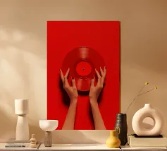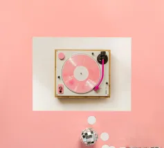 L'immagine mostra un giradischi in stile vintage visto dall'alto, con una forte enfasi su uno schema di colori pastello. La base del giradischi è una combinazione di legno e di una superficie morbida e chiara. Al centro del giradischi si trova un disco rosa traslucido che gira con un sottile riflesso sulla sua superficie. Anche il braccio è sorprendente, dipinto in un colore rosa brillante e appoggiato delicatamente sul disco, pronto a suonare.