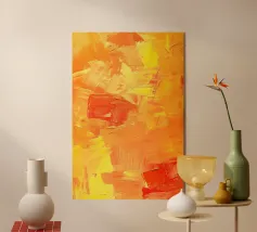 Un dipinto digitale astratto e dinamico, caratterizzato da forme geometriche dai contorni netti e dalle vivaci sfumature rosse, arancioni e gialle, su uno sfondo nero e bordeaux intenso. Il disegno evoca calore, energia e contrasto attraverso il colore intenso e la frammentazione angolare.