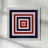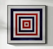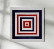 Un'impressionante astrazione geometrica di quadrati concentrici di colore indaco intenso, rosso vivo e bianco netto. L'alternanza di strati crea un audace senso di ritmo, simmetria e tensione visiva, fondendo minimalismo ed energia grafica. Questo pezzo modernista incarna l'equilibrio e il contrasto, rendendolo ideale per gli interni contemporanei con una forte attenzione al design.