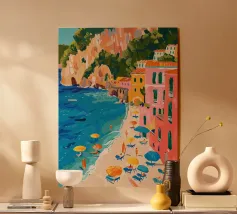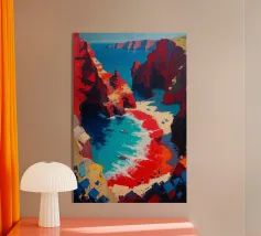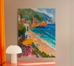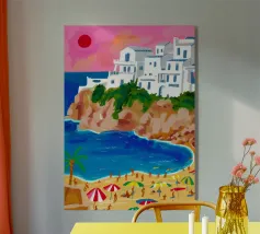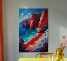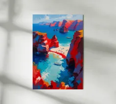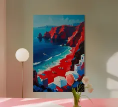 Quest'opera d'arte offre un'energica rappresentazione della Spiaggia Rossa di Santorini, con le sue imponenti scogliere rosse e il mare blu intenso. Le barche scivolano sulle acque calme, mentre i frequentatori della spiaggia si godono le coste assolate. Lo stile audace ed espressionista enfatizza il contrasto tra le rocce rosso fuoco e i toni sereni e freddi dell'acqua. Catturando sia la vivacità che la serenità di questa famosa destinazione, il dipinto dà vita all'essenza di una perfetta fuga nel Mediterraneo.