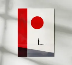 Audace e introspettivo, "Red Encounter" cattura una figura solitaria in un paesaggio surreale e minimalista. La geometria drammatica del cerchio e dell'ombra evoca i temi della presenza, della percezione e della trasformazione. Un equilibrio sorprendente di silenzio e simbolismo, ideale per interni moderni con un taglio concettuale.