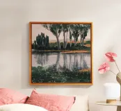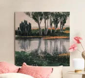 A quiet riverside scene where trees dance across the water in mirrored form. A lyrical landscape of balance and harmony.