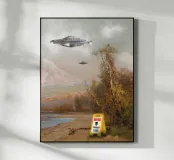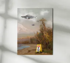 "In questo pezzo della nostra serie "Fake Paintings", si crea un collegamento tra i maestri della pittura di paesaggio ed elementi moderni per creare un nuovo contesto. Con un tocco di umorismo e di surrealismo pop, il fenomeno UFO viene affrontato nel suo contesto più misterioso. Quest'opera d'arte fonde la maestosità della pittura paesaggistica classica con l'intrigo dell'ignoto".