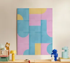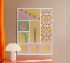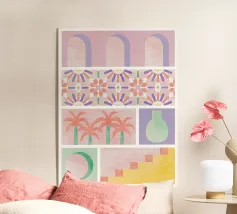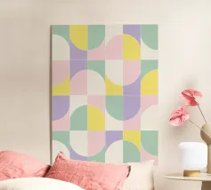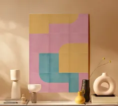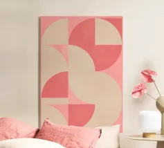 Motivo moderno di metà secolo ispirato ai pavimenti e ai murales in piastrelle di metà secolo. Linee slanciate, forme semplici, texture rumorosa e tavolozza di perle rosa.