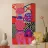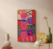 A dynamic abstract composition features bold, rhythmic shapes, spirals, and patterns in a vibrant palette of reds, pinks, blues, and black, creating an energetic and visually stimulating piece.