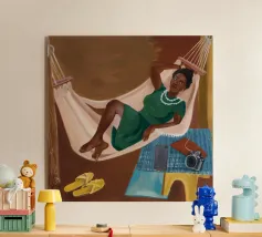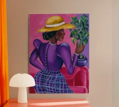 Questa opera d'arte mostra una persona seduta su una sedia a righe, circondata da girasoli e da una borsa verde. Lo sfondo è di un marrone tenue che crea un'atmosfera rustica e riflessiva.