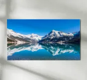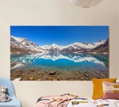 Un cielo azzurro e limpido si riflette perfettamente in un lago sereno circondato da maestose montagne innevate. Questa splendida scena cattura l'essenza della bellezza e della tranquillità della natura.
