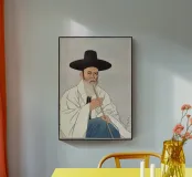 Questa avvincente stampa ukiyo-e su xilografia è il ritratto di un anziano coreano. È raffigurato in abiti tradizionali, tra cui un cappello nero a tesa larga e una veste bianca, con le mani che reggono con grazia una pipa a stelo lungo. Il suo volto, con i tratti profondamente delineati e una fluente barba bianca, trasmette un senso di saggezza e serena dignità. La resa dettagliata delle texture, dal tessuto della veste alle linee intricate del viso, si staglia su uno sfondo grigio chiaro. Questa stampa digitale ad alta risoluzione (7000x5000 pixel, 300 dpi) mostra magnificamente l'intricato disegno di