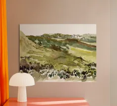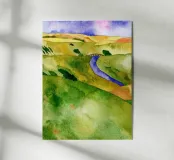 River Path is a serene watercolor landscape that captures the gentle flow of a river winding through sunlit hills. Soft layers of green, yellow, and blue evoke the warmth of summer and the calm rhythm of nature. This artwork radiates peace and harmony — a perfect piece for interiors that embrace light, tranquility, and the beauty of open space.