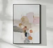 This abstract nature illustration combines soft colours in light pink, beige and light grey with organic colour fields, shapes and fine details. The combination of brushstrokes and muted tones creates a dreamy, whimsical scene that is perfect for modern interiors.