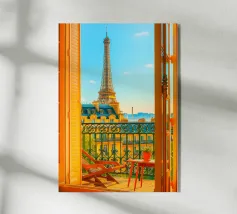 Una serata serena a Parigi, con la Torre Eiffel che svetta su uno sfondo di vibranti tonalità del tramonto. Questa immagine cattura l'iconico punto di riferimento da una prospettiva unica sui tetti, mettendo in mostra il fascino dei camini parigini e dei tetti danneggiati dalle intemperie. Il cielo rosa e blu pastello contrasta magnificamente con la struttura rustica degli edifici, evocando un senso di tranquillità e romanticismo. La scena invita gli spettatori a vivere Parigi da un punto di vista più intimo e sognante, celebrando il fascino senza tempo della città dell'amore.