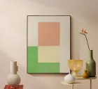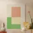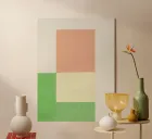 A minimalist composition featuring a large peach-colored rectangle is placed above a split block of green and cream. The image exhibits a serene and balanced arrangement of colors with a subtle overlay of brushstroke textures.