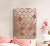 This elegant painting combines rose gold crystals and a symmetrical honeycomb pattern in soft shades of pink and cream beige to create a luxurious boho work of art. The fine details create an impressive grace and depth.