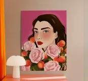A person with brown hair is surrounded by large pink roses, set against a matching pink background. The harmonious composition radiates calm and floral elegance.