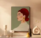 This highly elegant profile portrait showcases a woman with rich, ruby red hair meticulously styled into a bun. Her thoughtful, serene gaze, coupled with a simple gold earring against a soft green background, creates a timeless aura of classic beauty and sophistication.