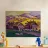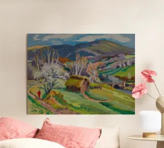 A vibrant painting shows a quaint farmhouse with a thatched roof, surrounded by sheep grazing in a field of purple and yellow, with rolling hills in the background, evoking a sense of bucolic life.