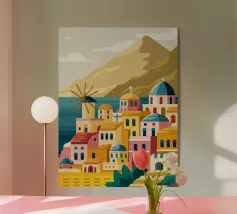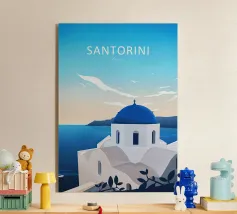 Design di viaggio minimalista della Grecia con le famose case bianche dell'isola greca di Santorini, le rocce vulcaniche e il blu del Mar Mediterraneo. Tipiche case graziose come nei villaggi di Oia e Fira.