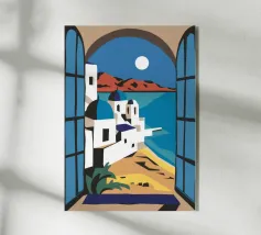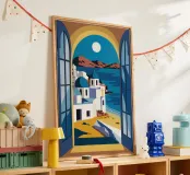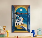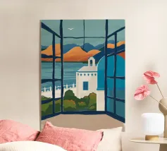 Una vista pittoresca dei classici edifici a cupola blu di un'isola greca come Santorini, visti da una finestra ad arco. Questa splendida scena cattura perfettamente il fascino idilliaco di una vacanza nel Mediterraneo.