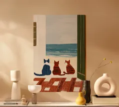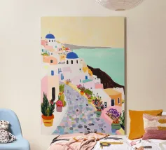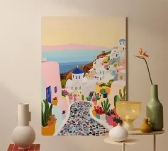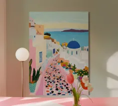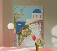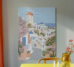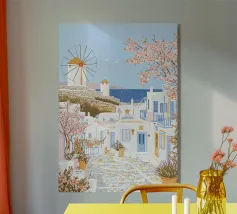 L'immagine mostra un idilliaco paesaggio costiero con case imbiancate a calce, porte e finestre blu e tetti color arancio, che si adagiano come terrazze su una scogliera rocciosa. Sullo sfondo svetta un mulino a vento, mentre il mare blu intenso luccica sotto un cielo limpido. Una vegetazione rigogliosa e fiori colorati costeggiano i sentieri. Lo stile è pittoresco e romantico, ispirato all'architettura mediterranea - in particolare all'isola greca di Santorini - e trasmette tranquillità, calore e bellezza senza tempo.