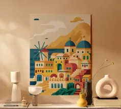 Una pittoresca illustrazione degli iconici edifici bianchi e delle cupole blu di un'isola greca, probabilmente Santorini, affacciata sul mare. La scena è una perfetta rappresentazione, inondata di sole, di un paradiso mediterraneo.