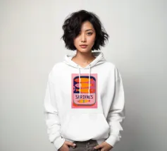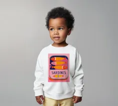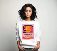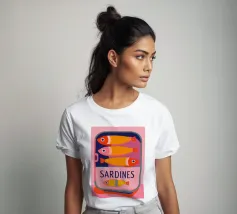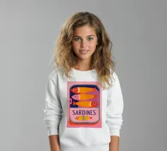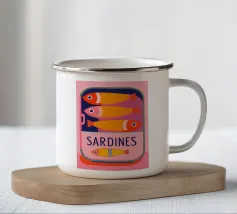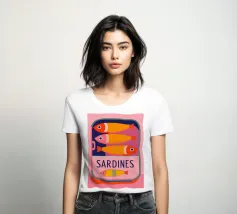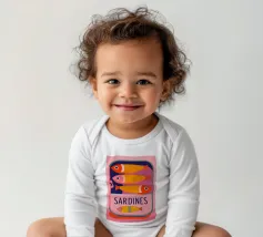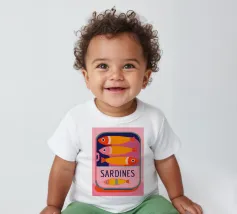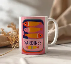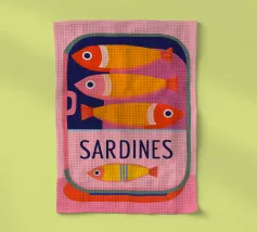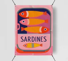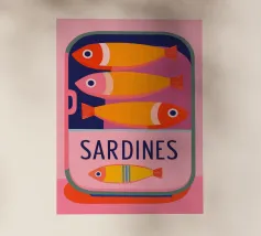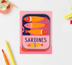Una divertente illustrazione di sardine in una scatola colorata con forme semplici e tonalità tenui.