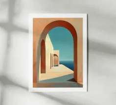 Un poster artistico che presenta un'architettura astratta con scale geometriche e calde tonalità arancioni sotto un cielo blu brillante. Ideale per una decorazione moderna e originale della cameretta dei bambini, questo visual evoca design, creatività e prospettiva. Perfetto per stimolare l'immaginazione dei piccoli sognatori.