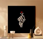 A skeleton hand art piece is depicted making a heart shape with its fingers. Above the fingers, a small red heart is visible. This fun art piece cleverly combines the iconic heart sign made by idols with a spooky skeleton motif. It makes for a unique gift for anyone who enjoys Halloween, skeletons, or even K-pop.