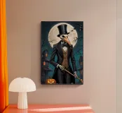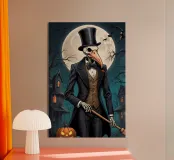 Scheletro in abito da cerimonia con zucca a becco di uccello e scopa plexiglass