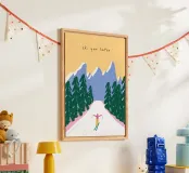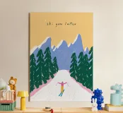 "Ski you later" - un gioco di parole tipografico incontra una colorata illustrazione invernale. Uno sciatore scivola rilassato lungo una pista bianca, circondato da abeti scuri e montagne viola. Il cielo si illumina di un caldo giallo pastello e conferisce alla scena un accenno di tramonto. Questo poster combina gli sport invernali con l'umorismo e una varietà di colori: un allegro richiamo per tutti gli amanti dello sci e della montagna.