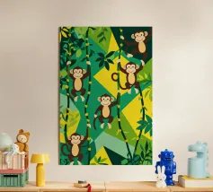 Scimmia felice appesa a una vite con fogliame plexiglass