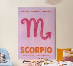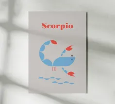 Una simpatica e colorata illustrazione del segno zodiacale dello Scorpione. Questo scorpione dall'aspetto giocoso, con dettagli a forma di cuori e stelle, rappresenta lo spirito intenso e affascinante dello Scorpione. Ideale per gli amanti dell'astrologia che desiderano aggiungere un tocco vivace e divertente al proprio spazio.